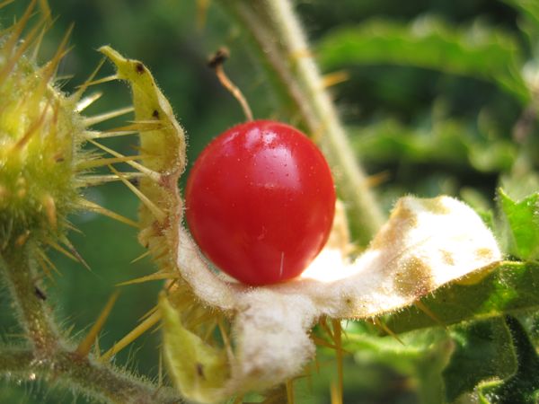 Dieses äusserst wehrhafte Nachtschattengewächs ist in unseren Breitengraden noch eher unbekannt. Die Litschitomate ist sehr hochwachsend (bei uns bis jetzt bis 1.60m hoch) und über und über mit äusserst fiesen Stacheln ausgestattet. Sie eignet sich, an einen strategischen Ort gepflanzt, ausgezeichnet dafür, unbefugten Nachbarshunden (oder -kühen) den Eintritt in den Garten zu verwehren, und auch die Früchte sind von einem Diebstahlschutz umgeben. Ganz ernsthaft: führen Sie an der Litschitomate keine Arbeiten ohne Handschuhe aus - jäten Sie nicht einmal ohne Handschuhe unter den Pflanzen, denn die Stacheln an den abgefallenen Blättern haben die unliebsame Eigenschaft, unglaublich langsam zu verrotten und sich tief in die jätende Hand zu bohren (und dort drin abzubrechen).