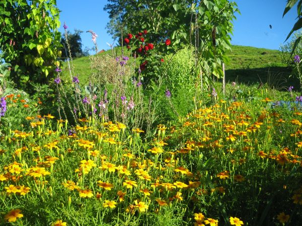 Auf all unseren Anbauflächen verwenden wir keinerlei synthetische Düngemittel und selbstverständlich auch keine Pestizide. Wir düngen mit Kompost, der mit dem Mist der eigenen Hühner angereichert ist, und ab und zu auch ein paar eingesammelte Kuhfladen der Nachbarskühe enthält. Auch Pflanzenjauche, vor allem Brennesseljauche, kommt zum Einsatz, und gegossen wird nur wenn es unbedingt nötig ist - und dann möglichst ausschliesslich mit Regenwasser. Auch sind wir mehr und mehr von den Vorteilen des Mulchens überzeugt, vor allem, seit wir über einen ziemlich gut funktionierenden Schneckenzaun verfügen und die Biester nicht immer wieder unter dem Mulch hervorklauben müssen.
