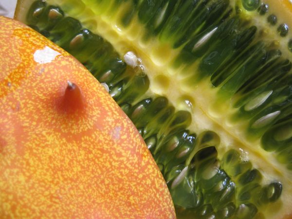 Im Inneren sind die Früchte, auch bei Vollreife, grün. Das Fruchtfleisch ist gallertartig und umschliesst die vielen Kerne fest. Am Besten wird die Frucht halbiert und das Fruchtfleisch herausgelöffelt, die Kerne werden mitgegessen. Der Geschmack der Kiwano erinnert erstaunlicherweise an Bananen und Zitrusfrüchte. Sehr speziell!