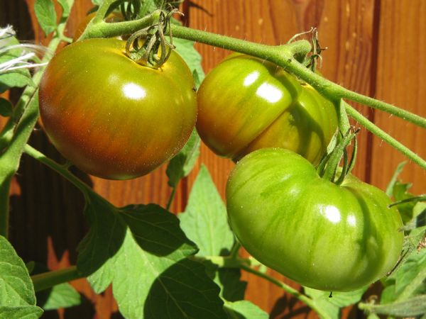 Dieses Juwel wurde wiederholt von allen Familienmitgliedern zur absoluten Geschmackskönigin unter den Tomaten erkoren. Die schwarze Krim ist hochwachsend (über 1.80m) und trägt Früchte, die erst dunkelrot-grünlich erscheinen, mit voller Reife aber dann immer mehr ins Rotschwarze übergehen. Dafür benötigt die schwarze Krim viel Wärme und Sonne. Die Früchte sind recht empfindlich und platzen oft auch unter dem (obligatorischen!) Regendach auf, deswegen lassen sie sich auch nicht gut transportieren und lagern.
